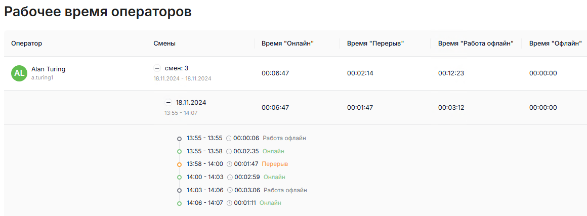 По умолчанию страница открывается на текущую дату и отображает время работы операторов, которые находятся на смене в данный момент, и историческую информацию, которая затрагивает текущую дату.