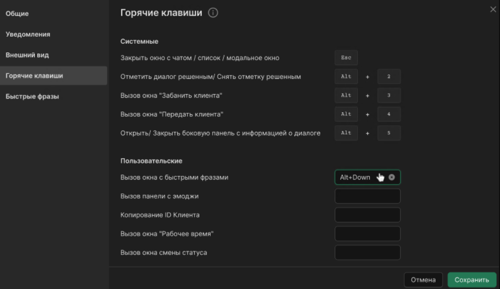 - Alt+2 — системой на диалог вешается отметка "Решен". Если у диалога уже выставлена метка "Решен", то при нажатии Esc метка "Решен" снимется.